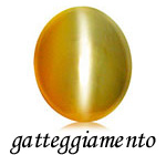 Il gatteggiamento è la manifestazione del cosiddetto “occhio di gatto”. Si tratta di una singola fascia luminosa che sembra muoversi sulla superficie della gemma a seconda del punto di osservazione.