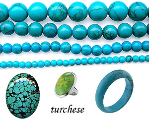 Il turchese è un caratteristico minerale poroso, di un colore che va dal blu al verde, e con una tipica lucentezza che ricorda la cera o la porcellana. Con una durezza che nella scala di Mohs va dal 5 al 6, questa pietra preziosa si presta molto bene alla lavorazione, per cui è possibile individuare il turchese come il componente base di moltissime collane, ciondoli e statuette.